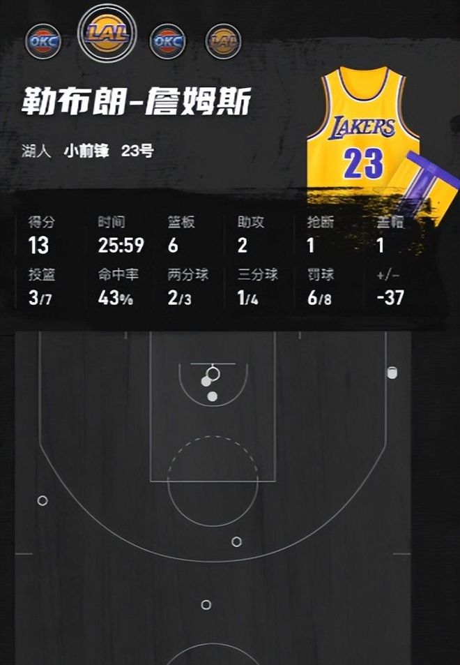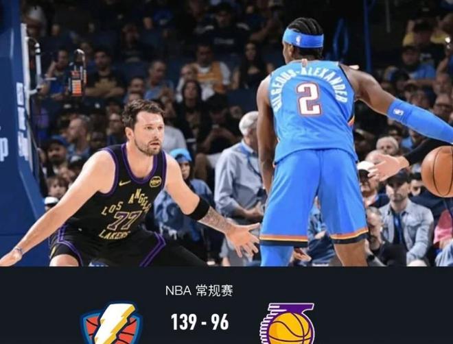 赛后技术统计显示,湖人全场仅得96分,而雷霆火力全开轰下139分,43分差距不仅创本赛季球队最大失利分差,亦跃居队史第七大溃败;同时,这一数字还打破了雷霆队史对阵湖人的最大赢球分差纪录。