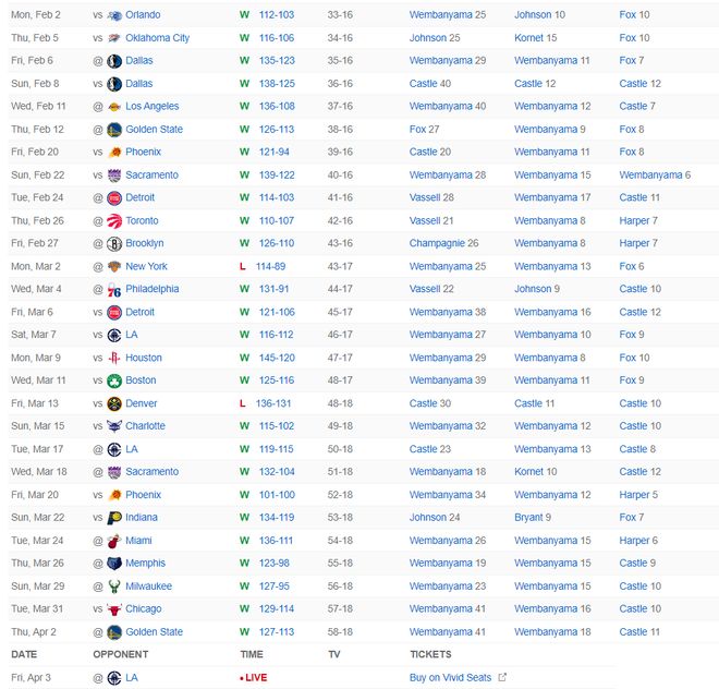 北京时间4月3日,NBA常规赛,马刺大胜快船拿到11连胜,最近的29场比赛马刺赢下其中的27场。这场比赛马刺最多领先快船26分,虽然快船一度追到个位数,末节马刺又一波流拉开分差,没有文班亚马也拿到背靠背胜利。